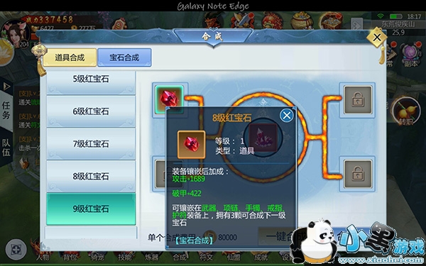 宝石合成需要消耗上一级的宝石以及部分铜钱,合成一个2级宝石则需要3个1级宝石以及10000铜钱的合成费用,依此类推,最终合成一个9级宝石则需要3个8级宝石和80000铜钱的合成费用。