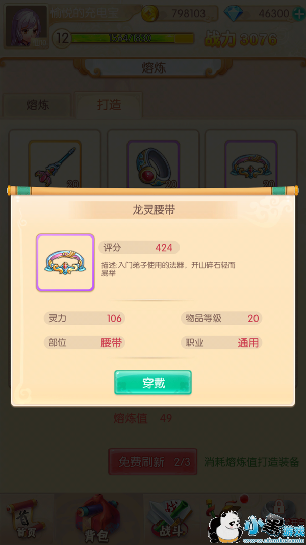 装备打造中有很多我们需要的装备,一次展示三件并可以刷新,看到自己中意的装备,便可消耗所需熔炼值进行打造。