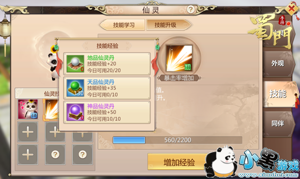 当仙灵等级达到60级之后,我们就可以对仙灵的技能进行升级了,通过技能升级,仙灵的技能效果将会获得质的飞跃,为我们提供更为强大的属性加成,我们可以通过消耗不同品阶的仙灵丹来对仙灵的技能进行升级。