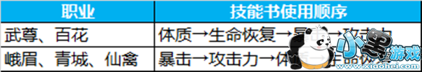 对于武尊和百花来说,生存能力是最重要的,所以我们把体质和生命恢复的技能书放在靠前的位置上,而对于青城、峨嵋、仙禽来说,输出显然要更重要一些,所以我们将暴击、攻击力技能书放在前面。