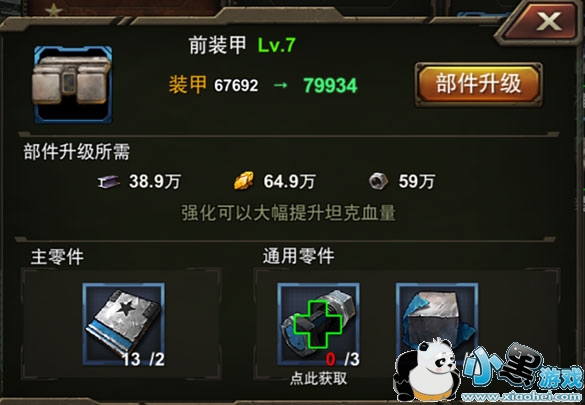 获得坦克后,强化坦克的部件也可以大幅度的提升坦克的战力,是性价比很高的提升方式。