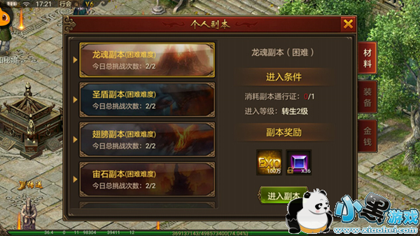 材料类型有龙魂、圣盾、翅膀、宙石、经验五种副本,可产出龙魂碎片、圣盾材料、羽毛、宙石结晶和经验。龙魂副本、圣盾副本、翅膀副本、宙石副本各有三种难度,每天各有两次进入机会。经验副本有五种难度,每天只有一次进入机会。角色转生等级越高,所能进入的副本等级越高。每进入一次副本,都需要消耗一张副本通行证。