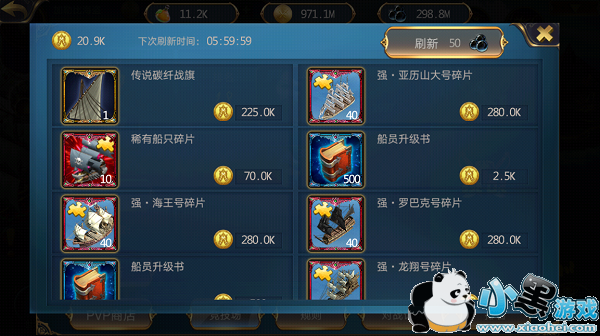 竞技场商店中可以买到船员升级书,以及一些稀有的船碎片,还有很多有用的高级装备。如果对目前货架内容不满,还可以用珍珠来刷新,这个商店中的商品,基本都是可遇不可求的稀有好物,所以说在高级排名上拿更多的竞技币,对你的提升来说相当大。