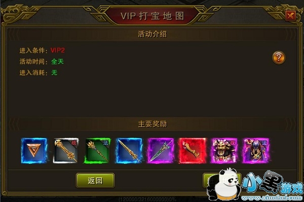 充值达到10元即可成为VIP,拥有进入VIP打宝地图的权利。VIP打宝地图分为三层,二三层的BOSS更为凶猛,掉落也更为丰厚。