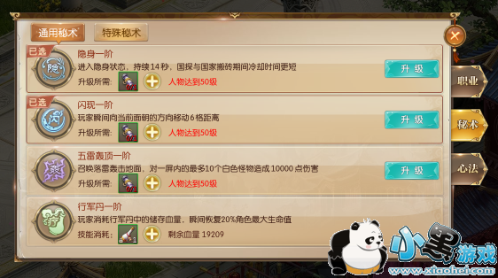 3.等级到达升阶要求后,在秘术技能界面,集齐相应数量的技能书,点击升级进行进阶。