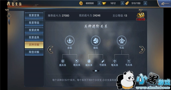 游戏中将武将分为三个兵种:骑兵、步兵和弓兵,根据兵种职业特点的不同三个兵种互有克制,以至于形成骑兵克制弓兵、弓兵克制步兵、步兵克制骑兵。如果合理搭配就能四两拨千斤,上阵使用相同兵种数量越多加成越高,一个队伍上阵兵种全部相同是可以激活对应兵种的国战技能。