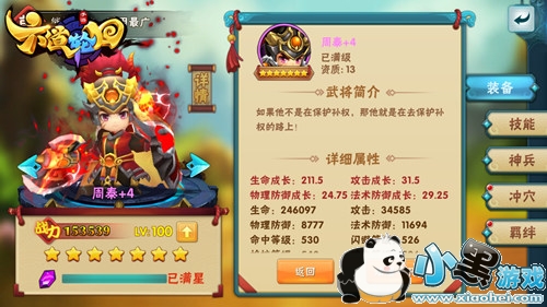 在英雄属性界面中我们可以看到,官方为周泰这位英雄的定义是前排法术型坦克。相信有过游戏经验的玩家都知道,法术型坦克一般只能扛法术攻击,对于物理攻击的防御性能比较一般。但在这里周泰却是不折不扣的全能坦克。点开英雄详细属性界面我们可以看到,周泰的物理防御和法术防御的属性基本一样高。注意,是一样“高”,而不只是“一样”!这样的一种属性成长,就决定了周泰这位英雄的适用范围非常广。不论对手是主法术阵容,还是主物理阵容,他都是一位非常可靠的前排坦克。至于其他的属性,例如命中、闪避、招架等,周泰中规中矩,并没有明显的短板,对于一个不花钱就拥有的初始英雄,还有什么好苛求的呢?