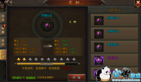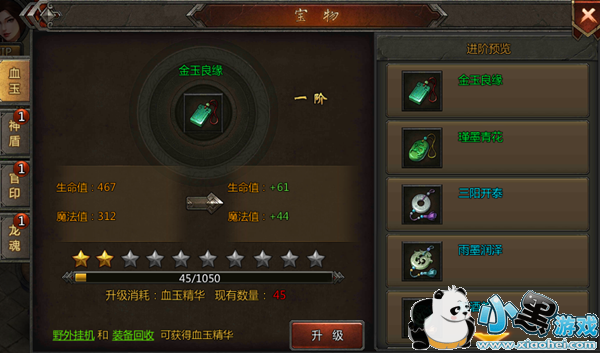 宝物系统由血血玉、神盾、官印、龙魂四大板块形成。