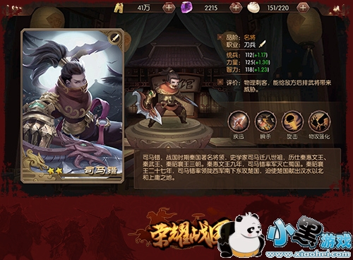 相信不少玩家都对于副本中庞涓的高伤害印象深刻,面对这种躲在后排输出的武将,正面强攻太容易损兵折将,这时候就需要有一位强突进武将打开局面了。这里推荐大家培养秦国武将司马错,作为2星武将入手难度简单,成型速度快,而且还拥有极高的单体输出。