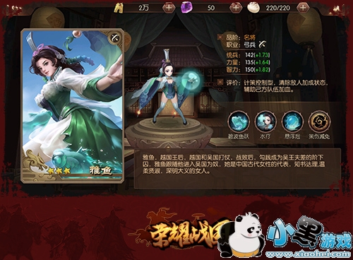 在历史上雅鱼是越王勾践的王后,她知书达理深明大义,无怨无悔地陪伴勾践度过了卧薪尝胆的艰难岁月。在《荣耀战国》中雅鱼同样是一位能在玩家前期“一穷二白”阶段提供绝大帮助的出色辅助。