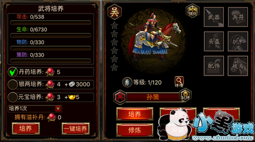 武将可以通过吃培养丹进行培养。培养有三种模式,一种是培养一次消耗5个培养丹,第二种是消耗4个培养丹+3000银两,第三种是消耗3个培养丹+5元宝。前期培养丹的数量有限,建议玩家可以选择第二种培养方式,可以节约一点培养丹,如果不缺元宝的玩家,当然可以选择元宝培养,这是最节省培养丹的方法,但是消耗元宝比较多。武将培养最好选择红将和主角优先培养,满培养可以为武将增加大量的属性。