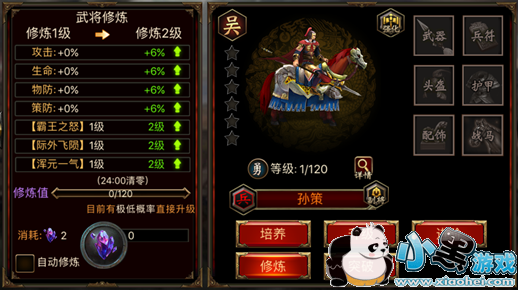 武将修炼也是快速提高武将战力的方法,武将修炼需要消耗修炼石。这里要注意的是武将修炼有机会产生暴击,达到直接升级的效果。这个看人品啦,但是玩家要注意的是武将修炼值每天24点清零,就是说如果当天无法把武将当前修炼值修炼升级的话,过了24点修炼经验条上的经验会被清零哦。所以建议玩家在修炼武将时候先把武将修炼石凑满再进行修炼,要不万一修炼到快升级的时候没有修炼石,隔天被清零造成的损失可不小啊。修炼每次升一级可以为武将提升三围6%,是个可观的数值哦。