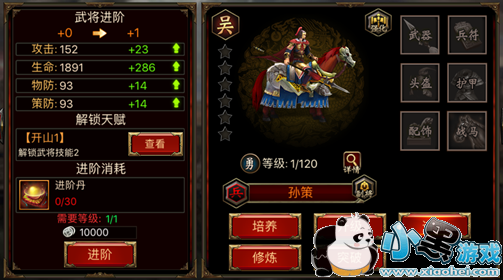 武将进阶是武将战力提升的一个重要方法,一方面武将进阶后会有三围的提升,另外进阶武将后可以解锁武将的进阶属性,进阶+7以后还可以拥有武将光环,为全体友军提供属性的增加哦。进阶+4前需要进阶丹。进阶+4和+5的时候需要同样的武将一个和进阶丹,进阶+6以上需要同样的武将两个哦,所以玩家平时看到自己主要培养的武将碎片一定要记得买,还有每天需要的武将碎片副本一定要刷,这样才可以快速的收集到自己需要的武将。
