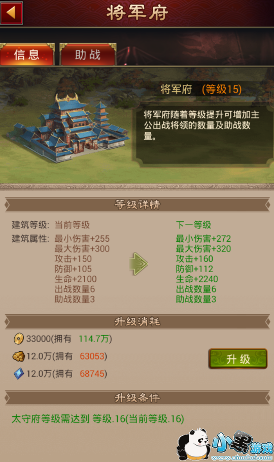 在信息页面可以看见将军府的当前等级和下一等级所提升的属性以及当前可以出战和进行助战的将领数量,同样也可以明确知晓当前等级提升的消耗以及升级的条件,需要注意的是将军府的等级是不能超过太守府的等级的。