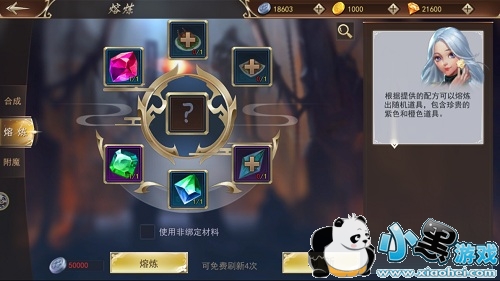 《浩天奇缘2》的熔炼系统需要使用六个材料进行合成,包括宝石、食物、药品等等。而这些材料的配方是随机的,玩家可以花费银币刷新不同的配方,选用更加容易凑齐材料的配方。