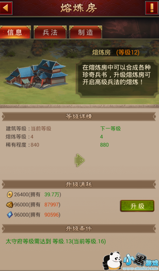 同样,在信息页面有着熔炼房的当前等级信息、升级消耗以及升级条件,还是要注意建筑等级以太守府等级为基础哦。