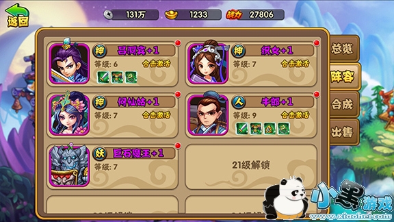 首先进入游戏,熟悉基本规则和玩法后,就可以开始速度推图了。前几章副本每一章中间的宝箱都会给一个武将或者装备,很容易就凑齐了入门阵容:吕洞宾,何仙姑,九天玄女,织女,巨石魔王。