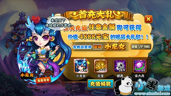 新手引导出来后,直接充值月卡,可以直接达到vip2,相比免费来说可以多拿两个橙将,vip里的孙悟空和首充礼包的小龙女。加上幸运抽如果能抽到红孩儿的话,这样上来就是三橙开局了,配上吕洞宾何仙姑的合击紫卡,前期基本无压力。
