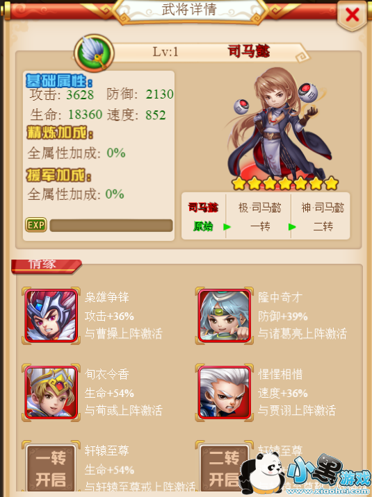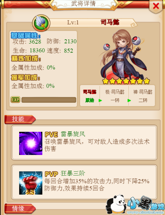 司马懿基础属性比普通七星武将多加%10。PVE副本技能雷暴旋风能对敌人造成多次法术伤害!兵种是军师,群体攻击带燃烧效果,在副本能把集中在一起的怪统统消灭掉。竞技场技能加强%35的攻击力下降%20的防御,技能仅次于神将吕布之下!
