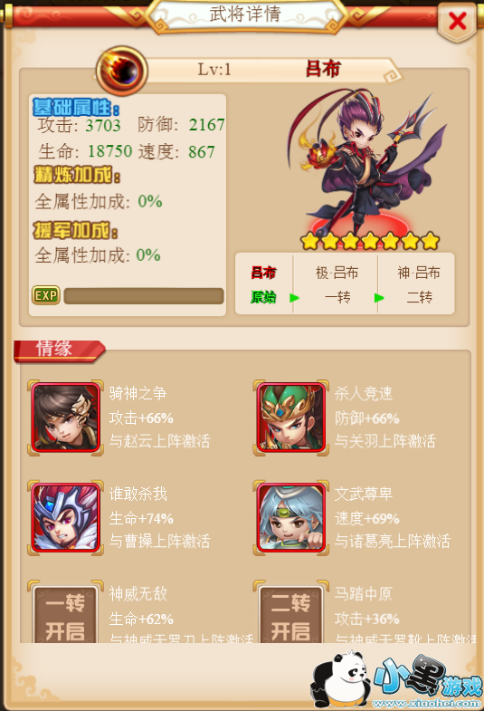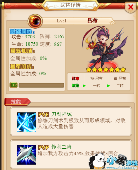 吕布基础属性比普通七星武将多加%20+情缘加成最多+情缘加双攻击属性!PVE副本技能刀剑神域能对敌人造成大量伤害!兵种是炮,群体攻击附带眩晕效果,副本推图过关的更加轻松。竞技场PVP技能加强%45的攻击力,真正的最强王者非吕布莫属!