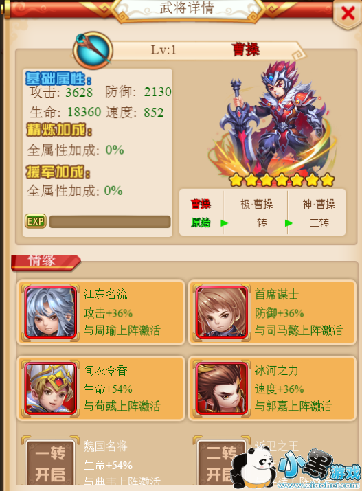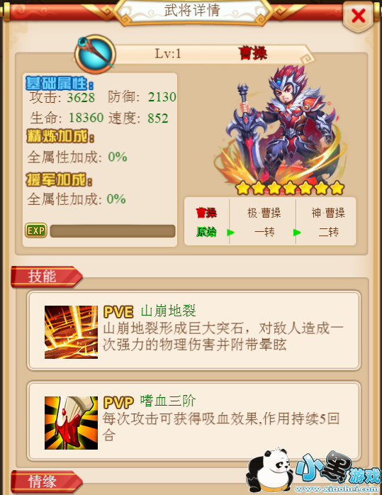 曹操基础属性比普通七星武将多加%10+优势在于曹操的6个情缘都是武将,不需要神装凑情缘,武将比较容易配!!PVE副本技能天崩地裂能对敌人造成大面积的伤害附带减速效果!兵种是法师,单体攻击带减速效果,能给副本BOSS致命的打击。竞技场PVP技能是回血,没错就是跟别人在竞技场上pk还剩一点血,只要触发了回血技能就有机会转败为胜!