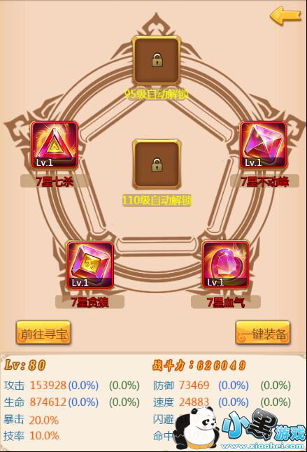 宝石:当玩家达到45级可开启宝石功能,往后随着玩家的等级上升,可佩带的宝石数将会增加。主要增加战力的宝石又称为稀有宝石,主要为攻击宝石、防御宝石、速度宝石、生命宝石。宝石可以升级,等级越高,增加的战力越多,7星宝石还可以突破,突破后增加的战力又更加惊人。可通过寻宝、VIP礼包、幸运转盘、超级幸运转盘等方式获得。