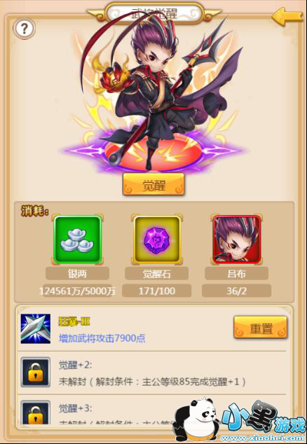 觉醒:7星以上武将可以觉醒,每个武将有三次觉醒机会,觉醒需消耗相同的武将若干个、觉醒石及银两。觉醒后可获得觉醒技能、提升战力的技能有加攻击、加防御、加生命。觉醒石可通过道具商城购买。如果觉醒等级不够高,还可以使用觉醒石进行重置喔!