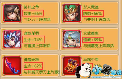情缘:每个武将都有属于自己的专属情缘,情缘由两部分组成,一是武将情缘,二是装备情缘,武将情缘只要情缘武将上阵或者在援军中即可生效。装备情缘需要武将进行一转和二转,当武将进化完成,且装备情缘装备,则可触发装备情缘。