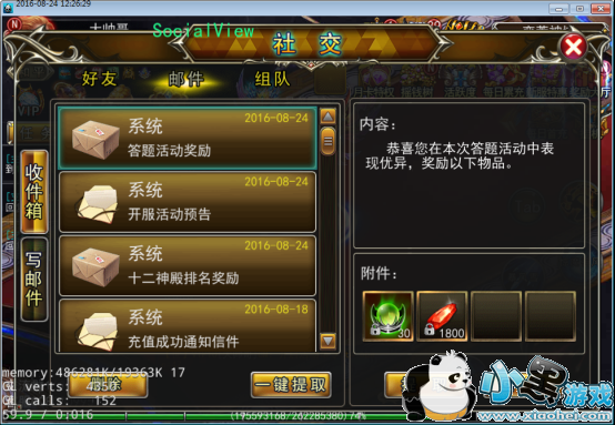 4.活动结束后奖励将以信件附件的形式发放,点击“提取”可将奖品放入背包。