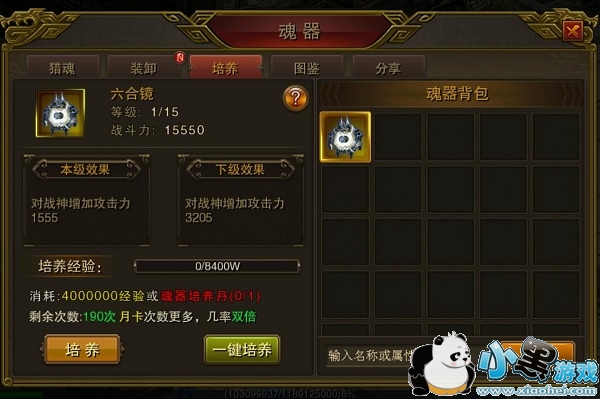 魂器可培养升级,培养消耗魂器培养丹或者人物经验,升级后魂器效果会变的更强哦!