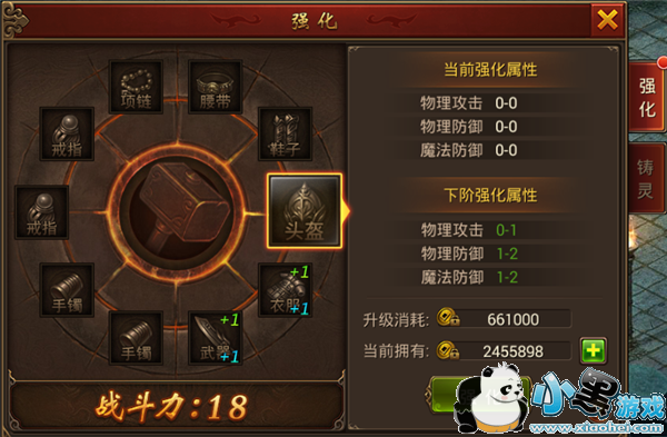 在强化页签中,可以选择对部位进行强化操作,强化可以提升各部位的攻击和防御属性,只需要你有金币,就可点点点,战力迅速提升!