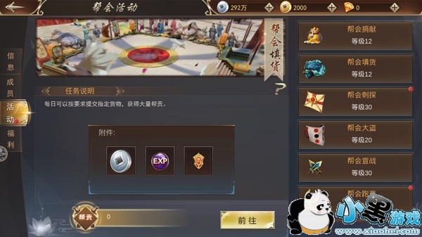 《浩天奇缘2》的“帮会填货”任务可以找帮会地图中的NPC“帮会商务官”领取,帮派每天都会有指定的道具需求,玩家提交每种道具都可以获得奖励,提交5种以上可以获得额外奖励。