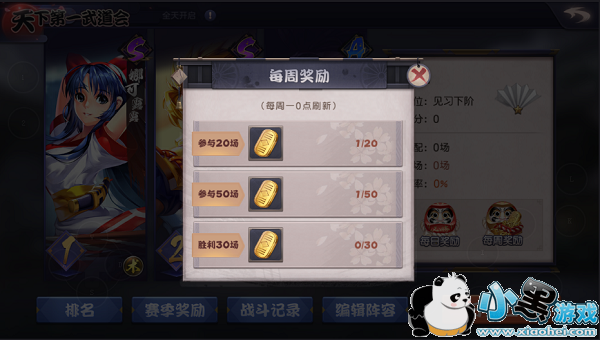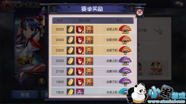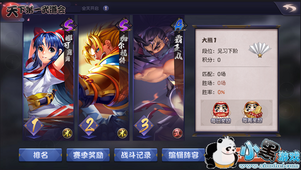 在该界面玩家可以查看当前武道会的信息,已经玩家武道会积分等信息,并且可以配置参与武道会的剑客