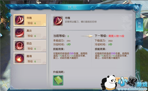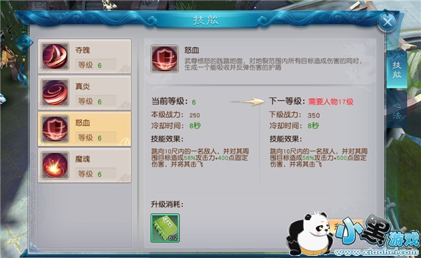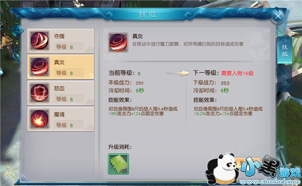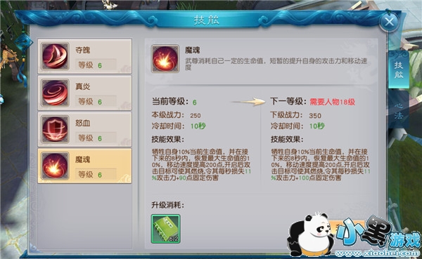 消耗当前生命值的10%,在接下来的8秒内回复最大生命值的10%,并且提升自身攻击力和移动速度,攻击还附带燃烧效果。这技能可以短暂提升武尊的伤害,虽然消耗生命值,但之后会进行恢复,总体是不亏的。至于提升的移动速度效果在战斗时虽然没啥用,但平时也可以用来赶路。