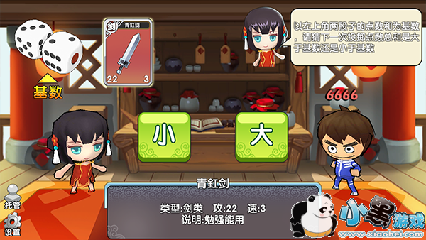 在酒馆玩法中,玩家每次需要根据左上角给出的基础点数(图中为5点)来猜下一次投掷出的2个骰子的点数之和是大于还是小于基础点数。猜对的话可以获得随机给出的战斗卡,如青红剑!点数一样时也算玩家猜对。猜对后玩家还可以选择是否继续猜大小的游戏,继续的话可以有机会再赢一张战斗卡,最多可以连续赢取5张战斗卡,但只要猜错一次就只能空手而归。
