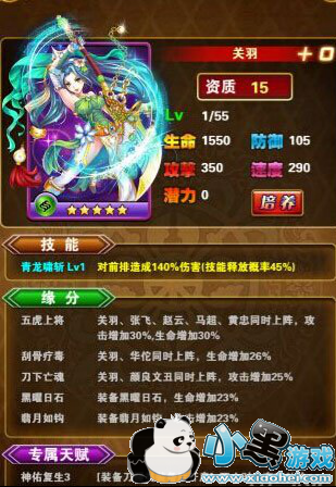 关羽算得上是每个人都巴不得收入囊中的少数几张卡牌之一。能攻能守,血槽又厚,转生后开启的天赋技能又都是防御加成系的,加上其强大的前排攻击技能,非常适合放在前排做强力肉盾。此前限时活动中奖励关羽的卡牌精魄,还没凑齐的玩家要加把劲了!