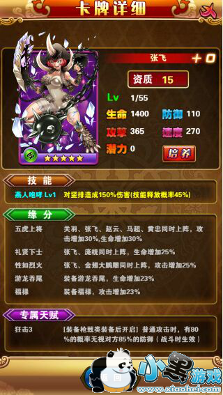 张飞这张卡牌的防御力是所有卡牌中最高的,生命值也相对比较客观,非常具有培养价值。其转生+4一旦开启,将拥有强大的吸血技能,对于前卫来说简直再好不过了。