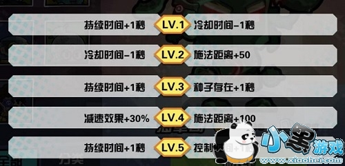 被动技能2:冷却时间-1秒;施法距离+50;种子存在+1秒;施法距离+100;控制时间+1秒
