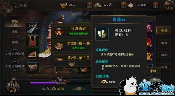 如果玩家选择了强化装备,就必须要获得大量的锻造石,而锻造石乃至游戏中所有材料的获得方法,都可以通过点击锻造石详情右下方的来源按钮来找到,方便玩家定点获得材料。