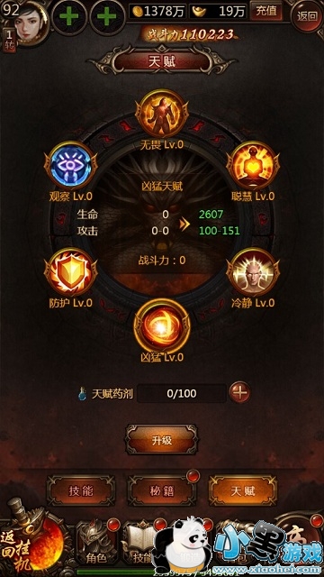 《传奇世界正版H5》的天赋系统共有六种天赋,分别是凶猛、冷静、聪慧、无畏、观察、防护。升级天赋可以增加玩家角色的生命、攻击等属性,从而提升战力,各位玩家不可忽视。