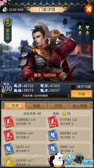 五、关于属性丹,针对性的属性丹给擅长能力和针对资质高的门客(比如武力丹你就给武力资质高的),随机丹的话给综合资质高的,集中吃,分散划不来。(建议,武力很关键,过关卡的兵力消耗跟武力有很大关系)建议优先升级资质好的,本人冲了首冲,给了一个吕布,武力很高。在前期帮助极大