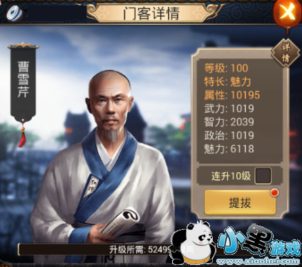 二、期我们最先接触到的就是门客了。门客属性分为:武力、智力、政治、魅力。这四项属性加一起就是玩家的势力值了,这些属性主要通过升级门客、为门客使用属性丹来增加