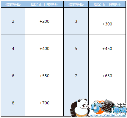 在游戏中每周对战金币获取是有上限的,我们要如何提高周金币获取上限呢?第一个方法是提高角色等级,22级和32级都能增加200上限。第二个方法是开通贵族特权,贵族特权的等级越高则每周金币获得上限也加的越多,通过下表让我们来具体了解一下贵族特权各个等级的加成: