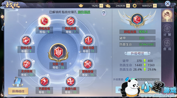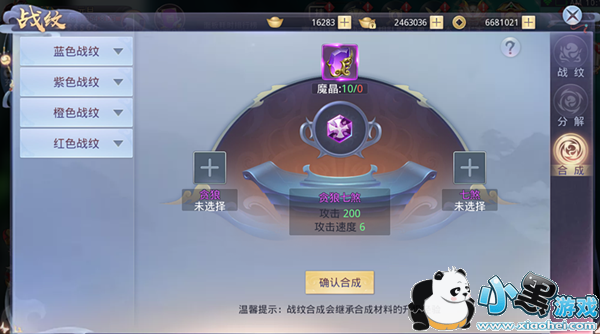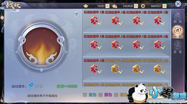 角色三转后开启战纹合成,相同品质的特定属性合成相同品质的双属性战纹,合成需要消耗特定的战纹和一定数量的合成道具。而合成的战纹会集成合成材料的等级经验并提升至对应等级,另外,这里要跟仙友们提示一下,合成的战纹分解是只会返还合成的道具哦,仙友们请记住啦~