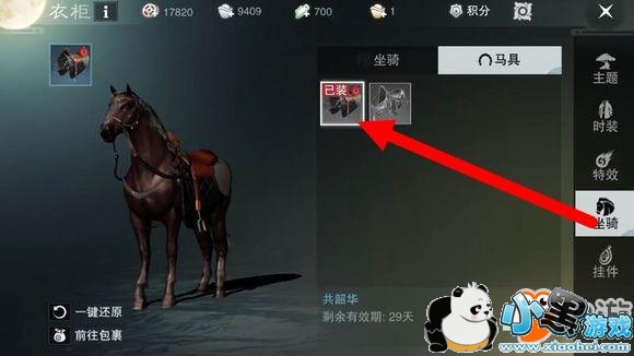 首先获得共韶华后,需要装备起来,步骤:打开个人衣柜-坐骑-装备共韶华。