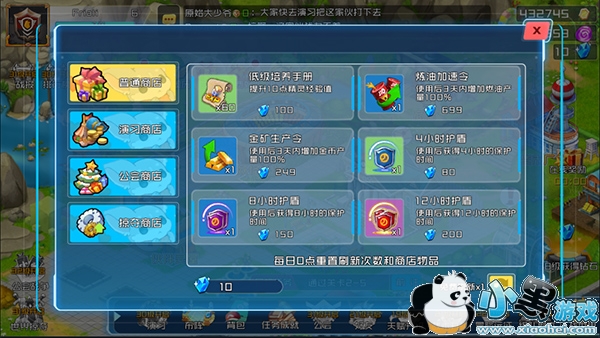 普通商店中有低级培养手册、金矿生产令、护盾等物品,每日零点重置刷新次数和商店物品。