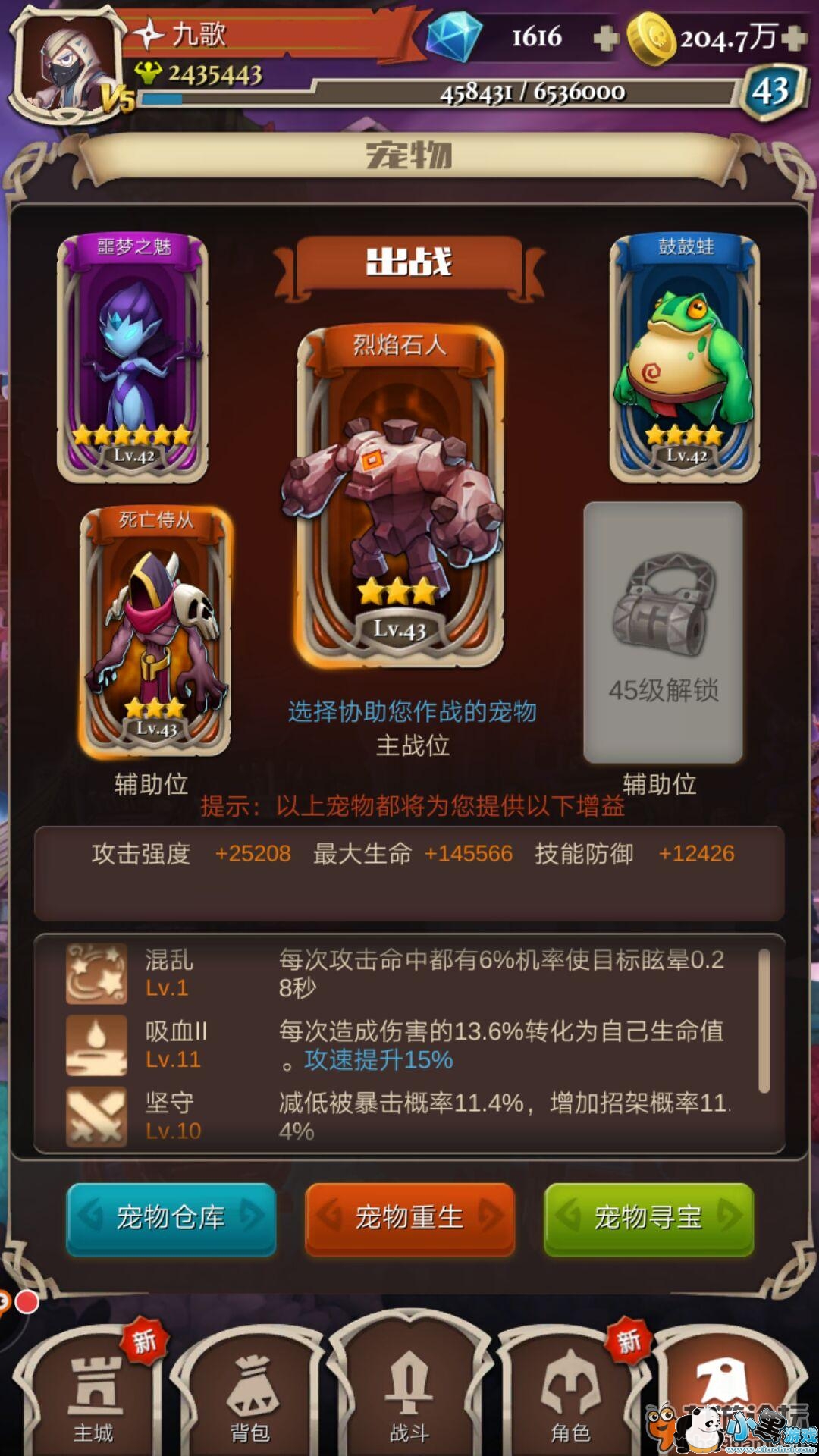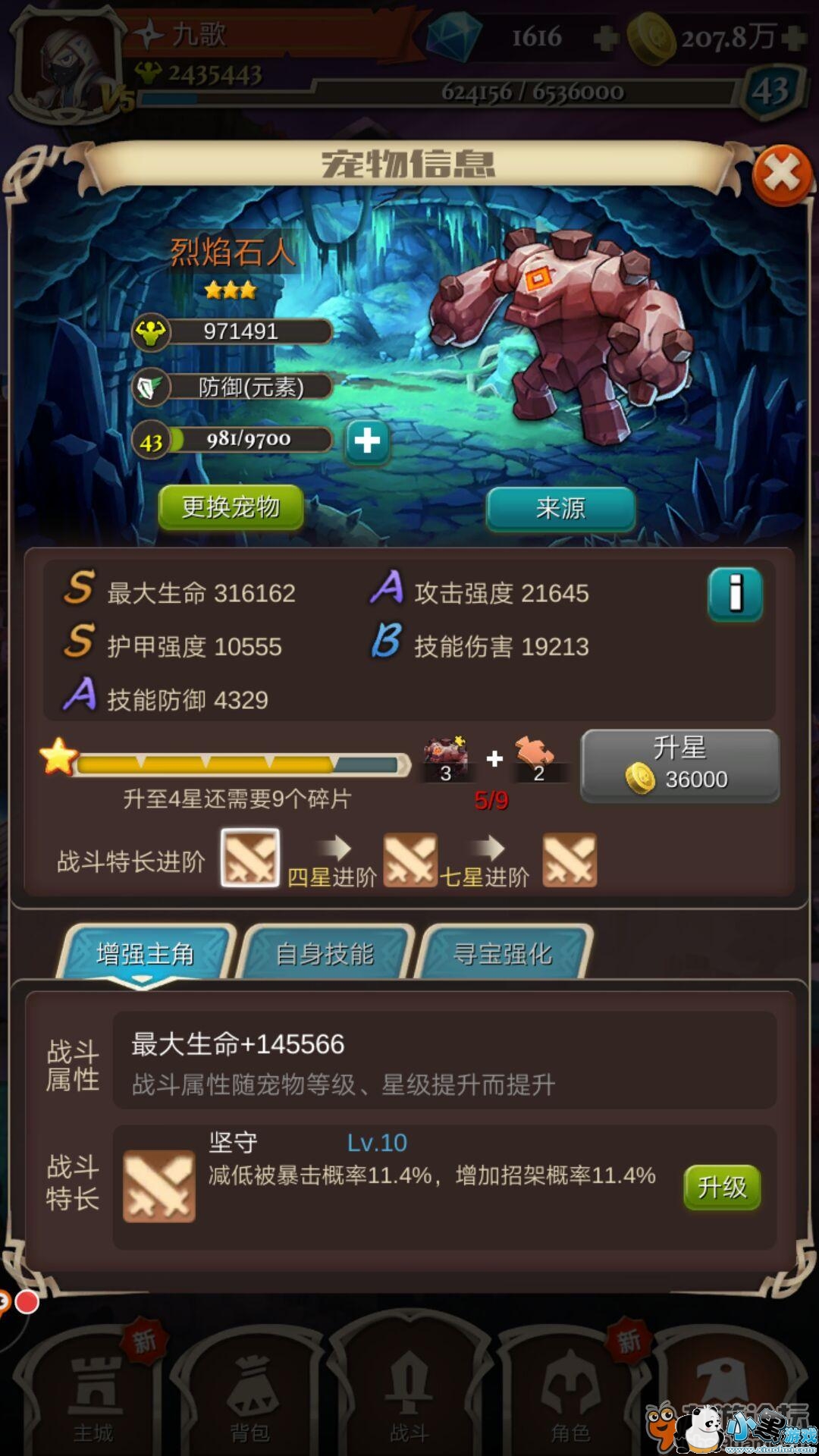 可以看到它加的属性为技能防御,这对于我们打战士来说很重要,战士的输出很大一部分都是靠技能,技能防御更能提高我们生存能力,而对于刺客有着高闪避的我们还怕吗?另一个橙宠我选择了烈焰石人,在所有橙宠里它是我们平民能最快升星的一个了
