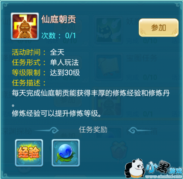 打开界面左上角,“日程”图标,然后点击日常任务,即可看到仙庭朝贡