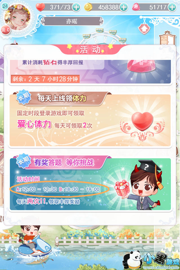 此外,还要注意“活动”,有的活动是有时间限制的,如果错过了,就只能下次参与了的呢。比如,下面的体力活动和答题活动,都是有固定的时间的。随着版本更新,也可能出新的活动,所以要常常查看有什么活动呢。