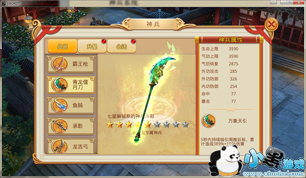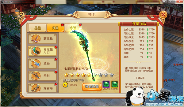 消耗相应的升星材料以及银两,可提高神兵星级,神兵星级提高,加成的属性也会随之提高,同时神兵技能也会随之增强